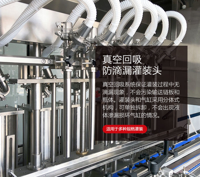 1、真空回吸系統(tǒng)保證灌裝過程中無滴漏的現(xiàn)象,并不會(huì)污染輸送鏈板和瓶身。灌裝頭和氣缸選用分體式機(jī)構(gòu),可單獨(dú)拆卸,并不會(huì)出現(xiàn)液體滲漏破壞氣缸的問題。進(jìn)口亞德客氣缸堅(jiān)固耐用,其它密封等零部件使用標(biāo)準(zhǔn)件,替換維護(hù)簡單便捷。