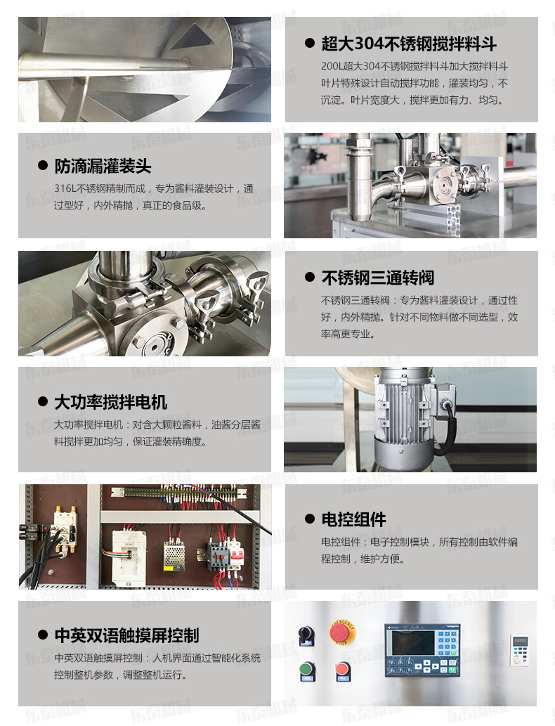 4.大功率攪拌電機(jī):對(duì)含大顆粒醬料,油醬分層醬料攪拌更加均勻,保證灌裝度。
